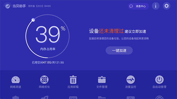 当贝助手tv版是一款专为智能电视和电视盒子设计的系统管理、优化与检测工具。它如同您大屏设备的“专属管家”,集性能优化、网络管理、应用卸载、屏幕检测等核心功能于一身,旨在解决智能电视长期使用后出现的卡顿、内存不足、网络不稳定等常见问题。通过当贝助手,用户可以轻松维护设备,释放系统潜能,从而获得更加流畅、稳定、纯净的观影和游戏体验。