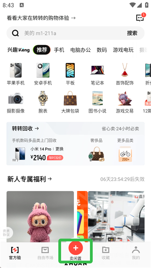 1、打开转转app,点击主页下方【卖闲置】。