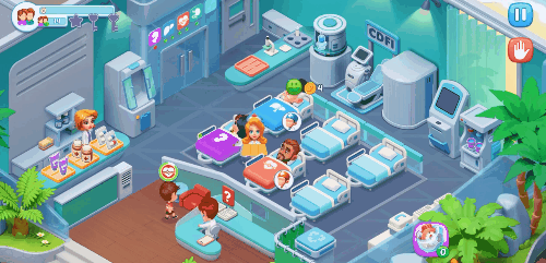 治疗过程简单,站在病床侧的医生会根据病人情况提示所需药物,此时护士会从药房取药或协助检查。治疗完成后,病人会自主离开、而玩家将获得奖励。