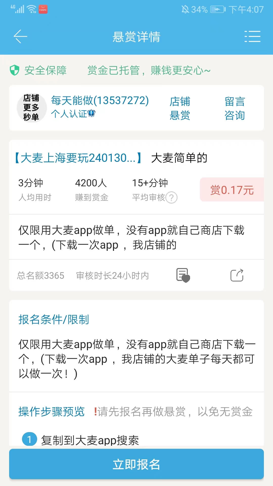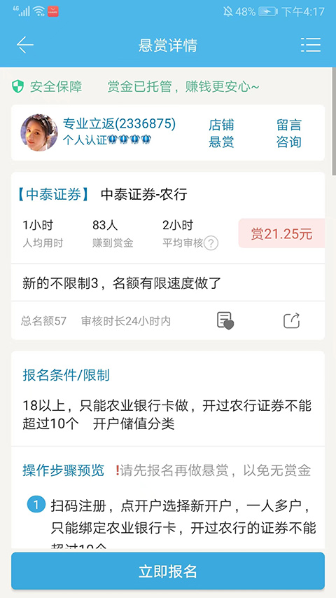 3、选择相应的任务,并浏览相应的要求后,我们就可以点击【立即报名】做任务赚钱了,