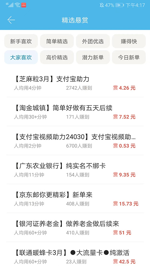 3、可筛选:最新悬赏、审核快、赚钱多、通过率高,选你所想。