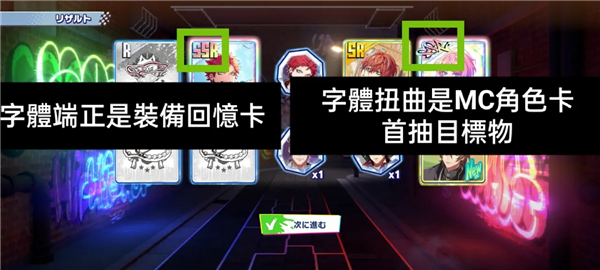 看到抽出 SSR 先不要太高兴,游戏裡分成 MC 角色卡和回忆卡。卡片左上的等级如果是喷漆涂鸦字体,才是首抽目标 MC 角色卡,正体字则是装备用的回忆卡。