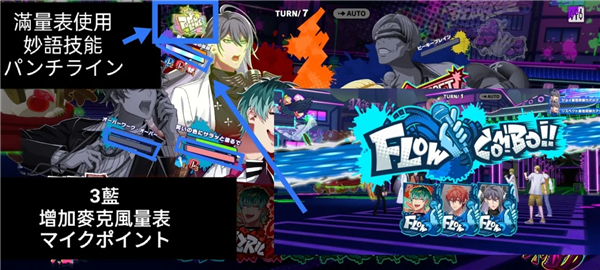 3蓝,增加麦克风量表(マイクポイント),满量表可使用“妙语技能”(パンチライン)。