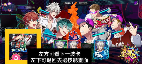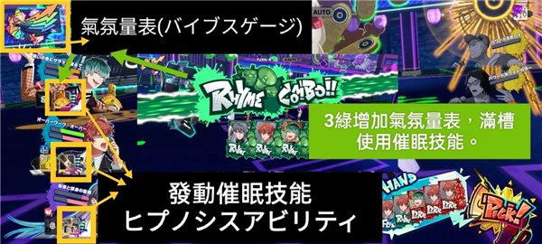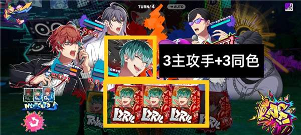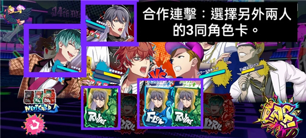2人连击,选择非主攻的人3张卡,所选的角色卡会和主攻手一起接力 Rap 连击,马上发动高攻击力集中干掉其中1位敌人。