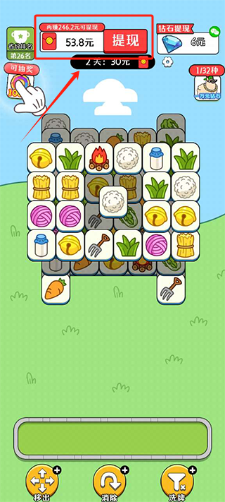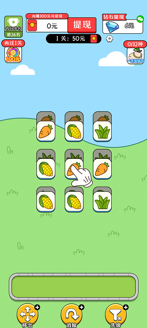 2、进入游戏之后,将三个相同类型的蔬菜进行点击,会进行消除然后会获得红包,将所有蔬菜进行消除后,获得五十的红包。