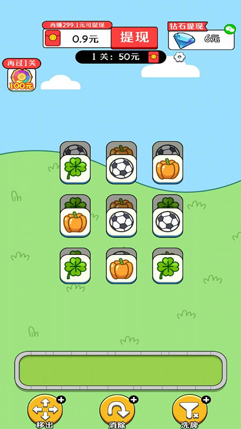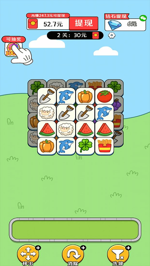 3、来到第二关之后,依旧是三种同样的图案进行消除,每通过一关会获得一直羊,获得羊越多提现额度越高。