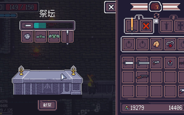 2、然后,地牢方面有着恶魔城一样的地图房间设定,还有贴心的房间传送功能。每次进入都是随机的地图,但是有几处是固定的。每层都有武器商人和食品商人,食品每层只能吃一次获得一个buff。