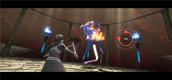 本作的战斗为全3D 的动作RPG,我们可以在地图范围中自由移动与敌人战斗,每一位角色除了普通攻击、踏步等基础动作之外还有两招技能可以使用,本作的属性相克只简单的分为火、水、风三种,一个角色会有不同属性的版本,例如笔者抽到的SSR 桐人是火属性,而SR 桐人则是风属性,战斗队伍为3 人小队可以针对关卡属性进行编辑,要是队伍中有指定角色组合还会有特殊的开场演出,例如桐人x 尤吉欧、亚丝娜x 爱丽丝等组合都可以触发。