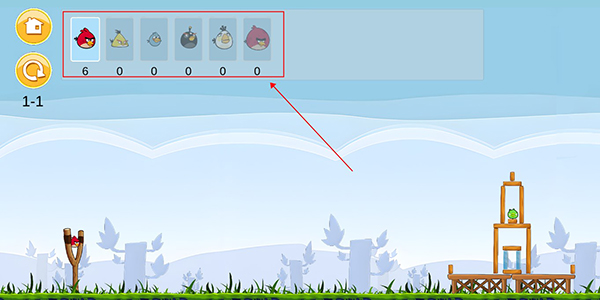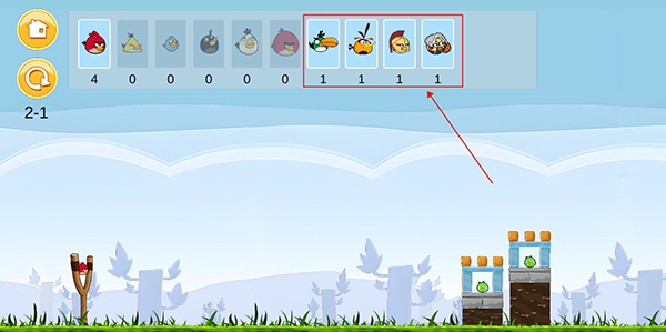 2、初战猪王:正常闯关模式,开局拥有六只小红鸟,每次通过都能加入额外的小鸟,小鸟耗尽后没有击败猪猪则为失败。