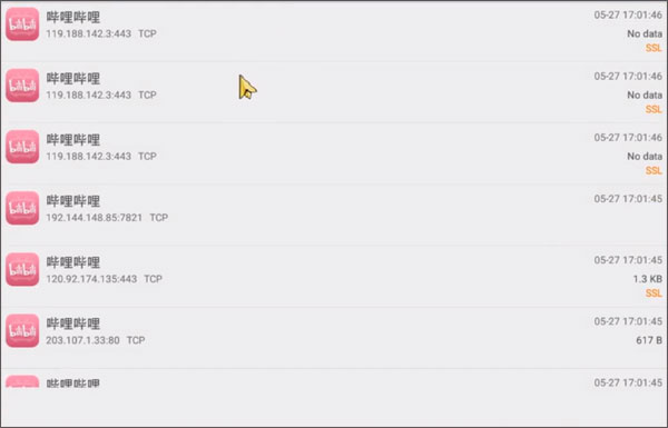 4、先从B站中将你想要抓取的直播源进行播放完之后,然后返回到app中关闭抓取功能键,你会看到有很多的记录。