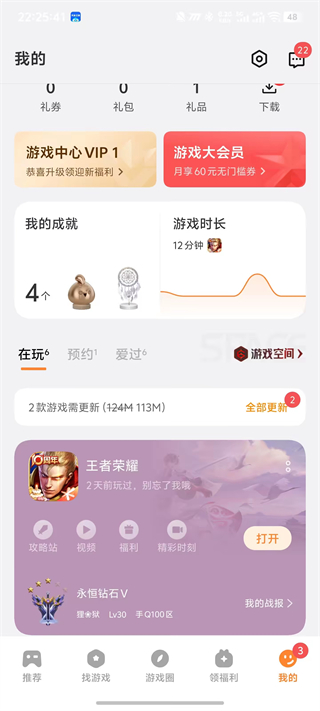 打开vivo游戏中心,点击底部导航栏的“我的”,在页面中可以找到游戏空间入口,点击即可进入。