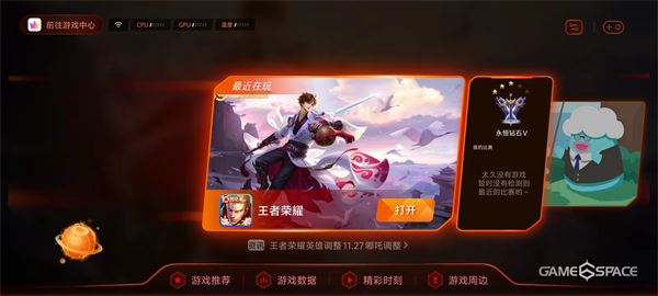 进入游戏空间后,你可以查看手机的使用情况,包括当前的性能状态,同时还可以查看游戏资讯和个人游戏数据,了解游戏动态。