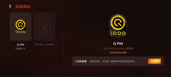 在游戏空间中,你还可以找到游戏周边,点击进入后,你将看到iQOO徽章,该徽章具有NFC功能,绑定特定游戏后,可以通过刷徽章来启动游戏,为你的游戏体验增添更多乐趣。