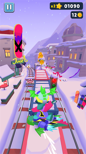 简单的滑屏操作(上滑跳跃、下滑滑行、左右移动)易上手难精通,3D卡通画风色彩鲜明,场景细节丰富。