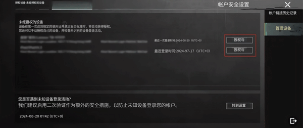 玩家可管理登入帐号的安全装置,可撤销装置授权管理或授权装置。