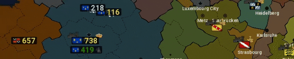 中后期有了钱,领土大了以后,可以稳定维持一定的兵力的情况下,面对实力相近并且接壤的敌国,可以采取战线防守反击,就是屯兵边境,修城堡和瞭望塔,宣战对方,诱使对方来攻,依靠防御加成大量消耗对方兵力,再推进战线,拿一两个地以后停战同化修碉堡,逐渐蚕食对方。