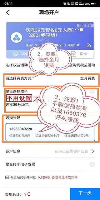 4、然后选择资费方式、号码等,勾选“我已同意协议”,点击“下一步”