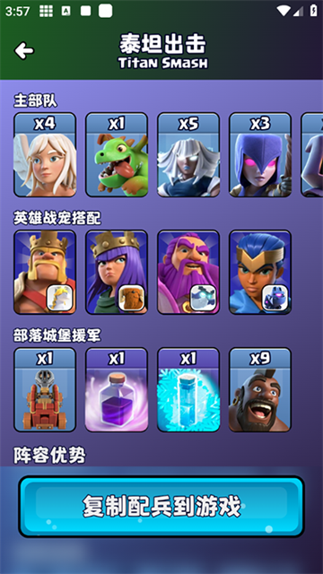 3、智能战术推荐与模拟:根据您当前的城堡等级、拥有的兵种和法术,以及攻击目标类型,智能推荐多种主流或黑科技战术流派。部分高级功能提供进攻路径模拟,帮助您在实战前预演进攻路线,优化下兵策略。
