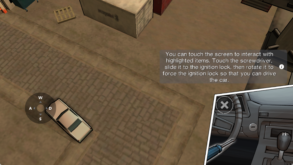 作为踏入社会的第一步,首先要学会如何让1辆不属于自己的汽车听话,按住螺丝刀不松移动到车的钥匙口处,根据提示左右不断旋转(画圈)。汽车马达开动,B加油前进,Y倒车,X上下车。开车来到提示点附近,按X下车走到提示点上,任务完成,切入剧情。