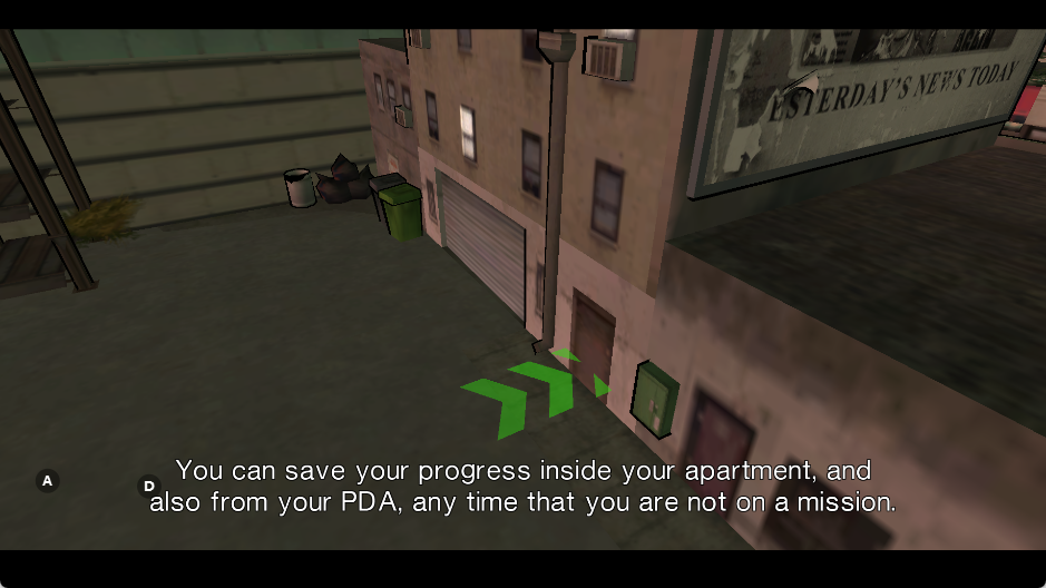 离开房屋后,走到上面的提示点处,Ling的出现让黄大为震惊,没想到这个表面文弱的女子竟然是格斗“顾问”。剧情后其实是格斗教习,不过请把你的目标对准右侧的靶子,如果你直接攻击Ling,任务随即宣告失败。按A键拳攻击,连续按A发动连续攻击,A+B飞腿攻击,实际操作几次后。开始手枪教学,按R锁定目标后,按A射击,连续射击靶子,完全破坏后,Kenny从侧面门出现,原来他经营的餐馆正受到某混混的骚扰,是该主角大展拳脚的时候了。跟随Ling走,没走几步,Ling再次展现英雄本色风范,她告诉黄,她平常已经将枪械藏在这个城市的各个垃圾桶……