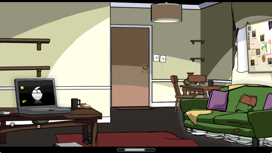5、剧情后,根据提示点走到自己的住处,进入后点击笔记本看一下2封信,右边墙壁上可以查看任务,点击沙发可以存档。随后出门,地图上出现K字样,前往K点。