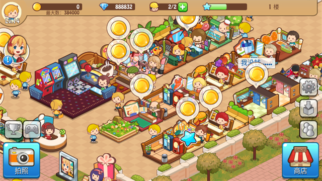 进入游戏以后,每过一段时间,各个商店的上面会出现金币的符号,这时候我们就要点击金币的符号进行收集,来增长我们的资产。