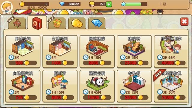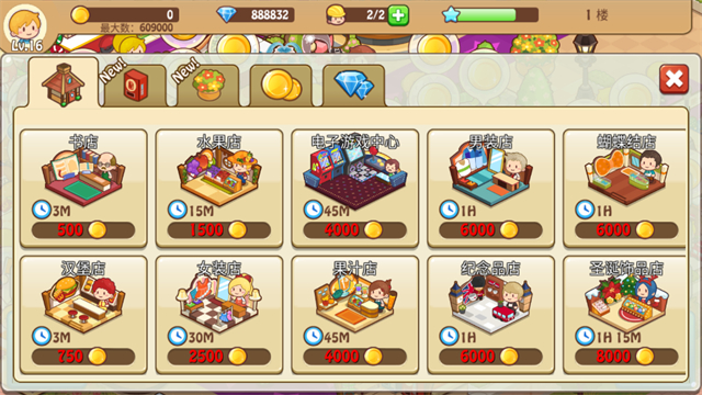 1、自由组合的店铺系统:游戏内拥有拉面馆、服装店、电影院等数十种店铺,店铺之间会产生“集客效果”,搭配得当能让客流量成倍增长。