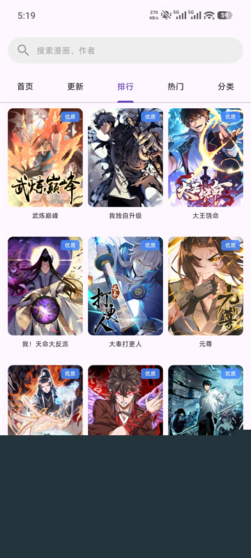 1、打开挽离漫画App,在首页可通过搜索功能快速查找漫画,也可通过「热门」「排行」等栏目浏览发现感兴趣的作品。