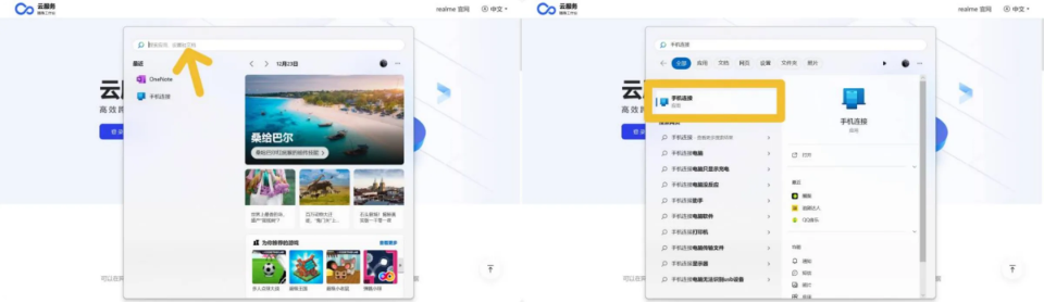 电脑端:开始菜单——搜索框搜索“手机连接”