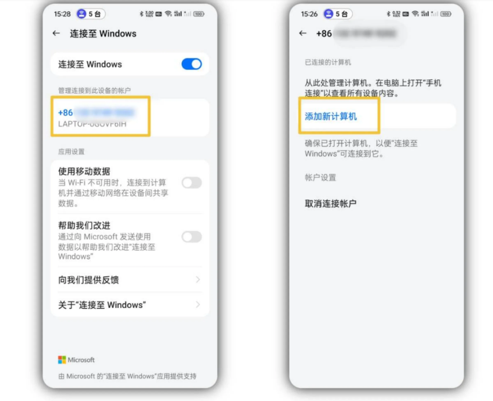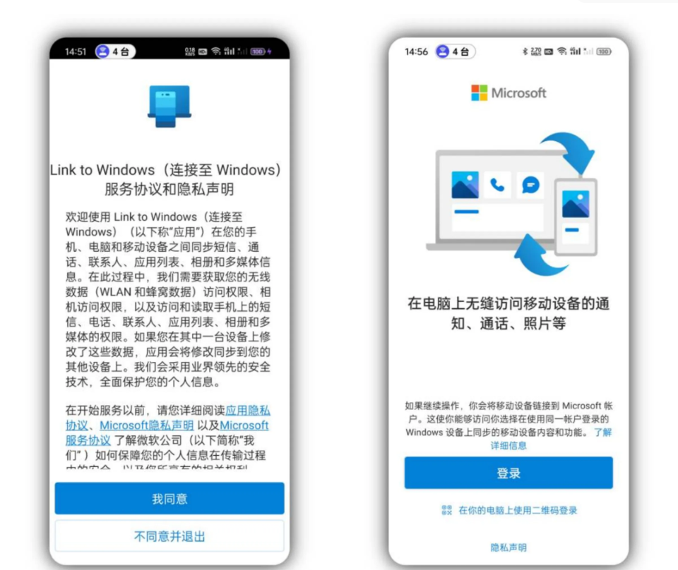 第一步:手机端进入连接至Windows界面后,同意服务协议和隐私声明,登录与电脑设备相同的微软账号