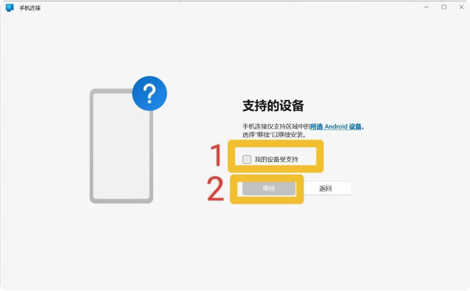 第四步:设备是否支持勾选我的设备受支持,点击继续