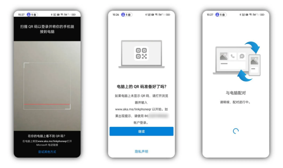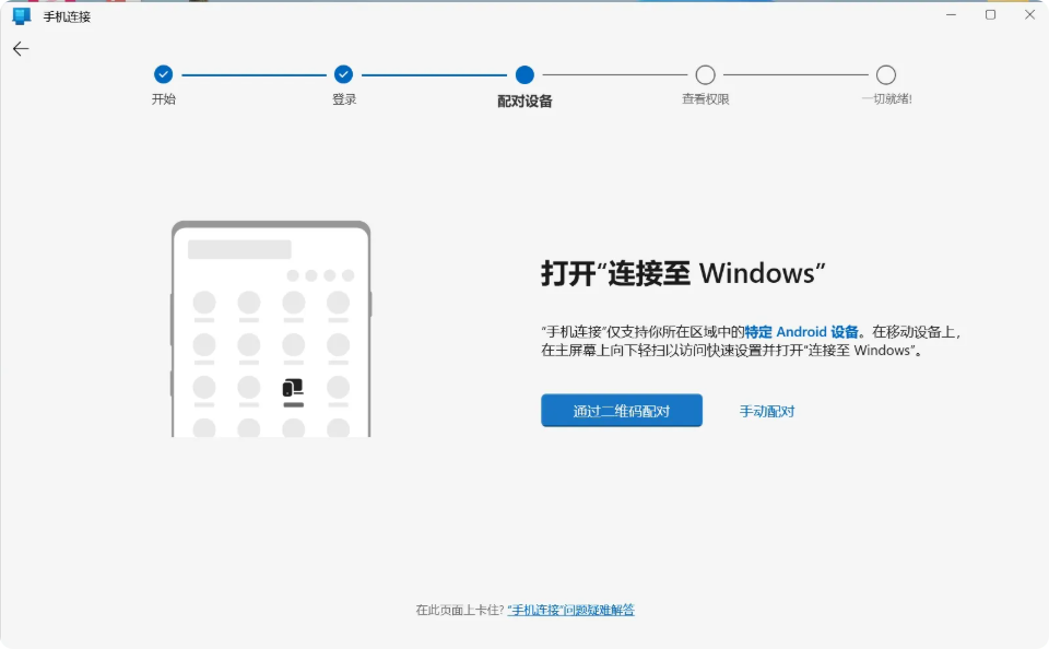 第五步:如果你的电脑登陆了微软账号,会直接进入如图所示的连接第三步,进行配对连接(提供了两种配对方式,分别是二维码配对与手动配对,本文选取二维码配对连接,更方便快捷),电脑端会出现QR码