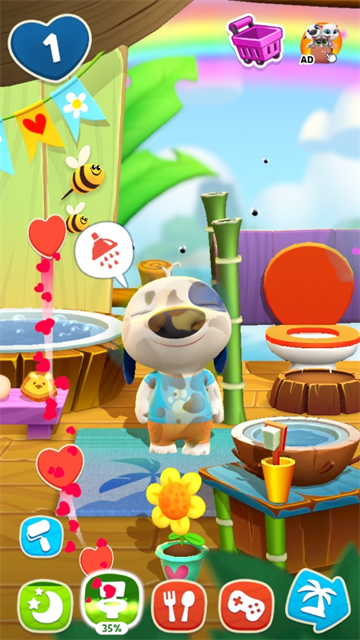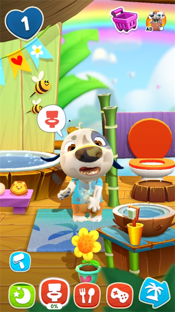 通过了教程便来到了主界面。主界面稍微有些杂乱,但还是很容易辨认的。上角为你拥有的货币,屏幕中央便是我们的主角——汉克狗,下方分别是经验值条以及功能按钮,从左到右依次是:玩耍、饮食、洗浴、睡觉、探险、小游戏,上方是金币左上角便是汉克狗的等级了。