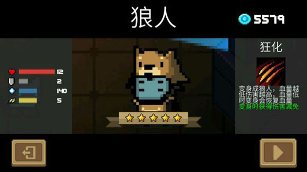 技能——狂化:变身成狼人,血量越低伤害越高,血量低时变身会恢复血量。升满星后变身时获得伤害减免。