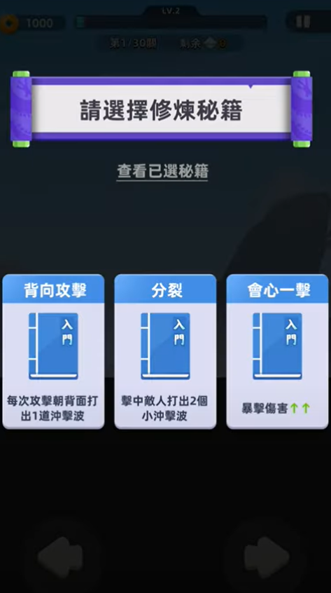 每局游戏开始后,玩家在升级时都会面临随机秘籍的选择。是选择增加攻击次数的“七伤拳”,还是召唤飞剑的“独孤九剑”,甚至搞怪的“葵花宝典”?不同的组合将带来截然不同的战斗体验。