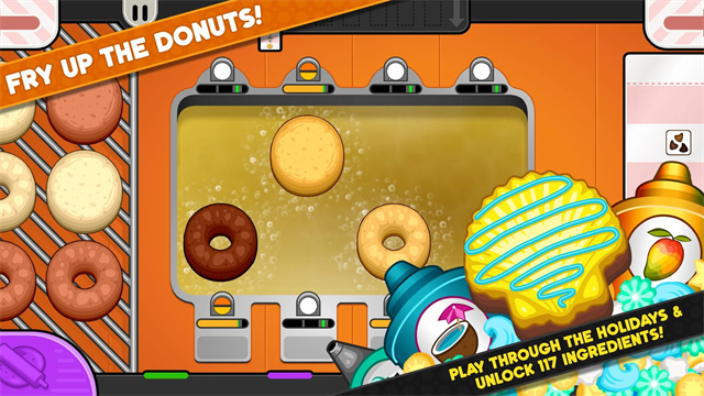 游戏采用美式漫画风格,色彩鲜艳明亮,人物造型夸张可爱。无论是热腾腾的油炸锅,还是色彩缤纷的甜甜圈,都让人食欲大增,营造出轻松愉快的氛围。