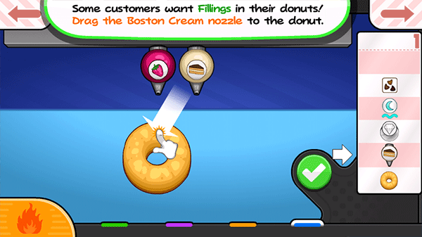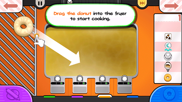 游戏提供了极高的自由度来制作甜甜圈。你可以选择多种面团(原味、巧克力、全麦等)、决定油炸时间(影响颜色深浅),然后挤上各种口味的淋酱(草莓、香草、花生酱),最后撒上丰富多彩的顶料(糖针、坚果、棉花糖等)。每一个甜甜圈都是独一无二的。