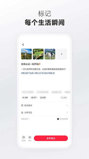 1、收藏即人生:用户可以创建各类公开或私密的收藏夹,将喜欢的笔记分类整理。你的收藏夹往往就是你向往生活的缩影。
