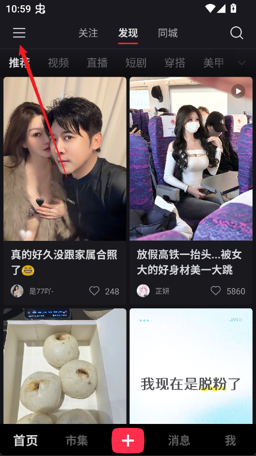 1、打开小红书,点击页面左上角的菜单入口进入功能列表。
