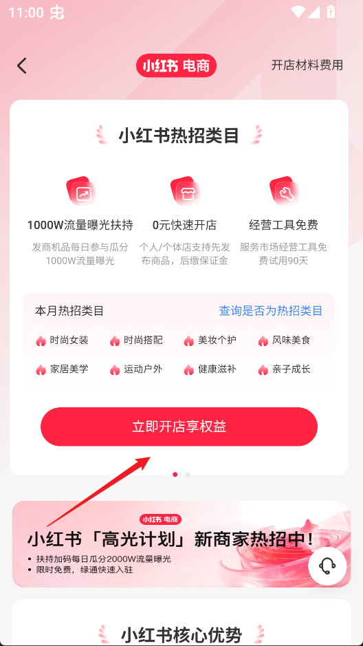 4、向下浏览页面,找到【开通店铺】相关入口。