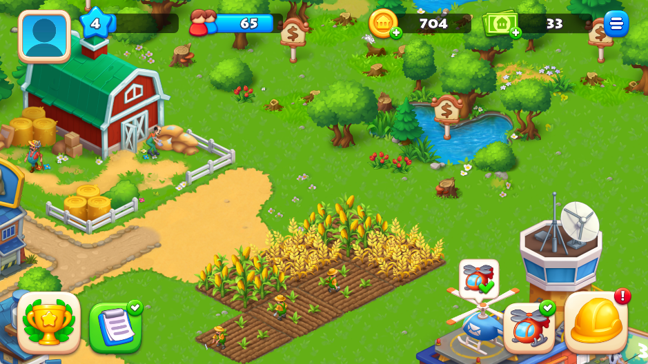 1、农场与城市双核心:游戏巧妙融合了农场种植与城市建造,你既要经营农田和工厂,也要建造房屋、社区建筑,让小镇充满活力。