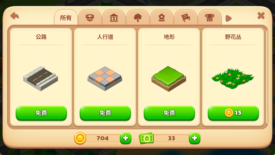 装饰物:道路、人行道、地形等可自由设计,打造个性化小镇。