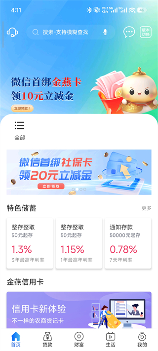 展示特色储蓄产品及金燕信用卡服务,提供多种金融业务入口。