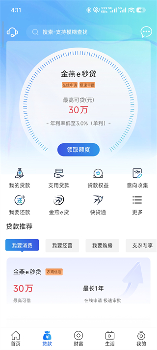 4、贷款服务:支持农户小额贷款申请、进度查询、还款管理,包括“金燕e贷”“乡村振兴贷”等特色涉农贷款产品,助力农业生产和创业发展。