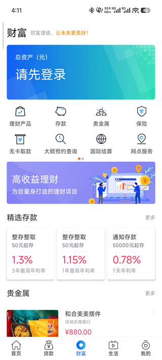 涵盖理财产品、存款、贵金属、保险等财富管理业务,提供无卡取款、大额预约查询等服务,需登录查看总资产。