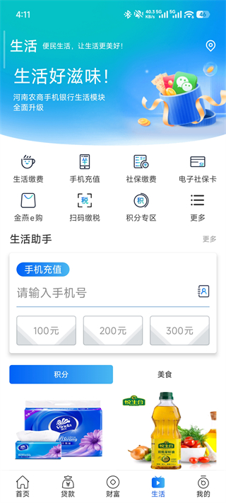提供生活缴费、手机充值、社保缴费等便民服务,还有金燕e购、扫码缴税及积分兑换商品等生活助手功能。
