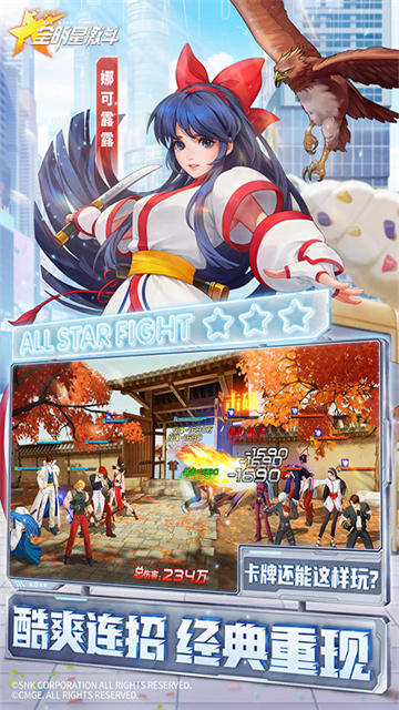 全明星激斗是一款由SNK正版授权、精心打造的3D回合制卡牌手游。它不仅仅是一款普通的IP合集游戏,而是一座为全球格斗家粉丝打造的“移动档案馆”和“梦幻乐园”。在这款游戏中,SNK旗下多部经典作品中的人气角色将打破次元壁,汇聚于同一个世界。玩家将化身为“集结者”,不仅能亲眼目睹《拳皇》系列的草薙京、八神庵,《侍魂》系列的霸王丸、娜可露露,以及《饿狼传说》中的特瑞、不知火舞等角色同台竞技,还能招募他们,组建属于自己的梦幻战队,展开一场前所未有的策略对决。作为一款由SNK正版授权、精心打造的3D回合制卡牌手游,它不仅是一款游戏,更是一封写给SNK粉丝的情书。它将昔日的热血沸腾与今日的移动端便利性完美融合,让玩家随时随地都能重温那段激情燃烧的岁月。无论你是寻找情怀的老玩家,还是喜欢策略卡牌的新朋友,都能在这里找到属于自己的乐趣。
