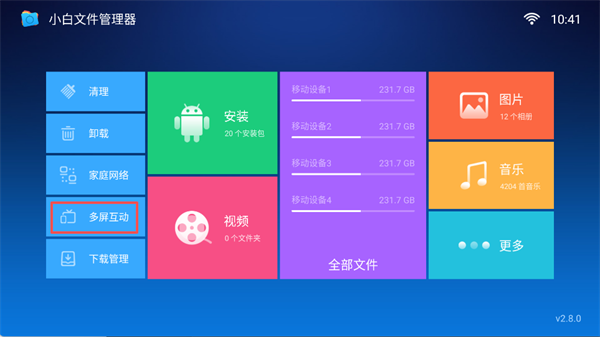 1、首先在电视、TV盒子等目标设备上安装好“小白文件管理器,点击【多屏互动】