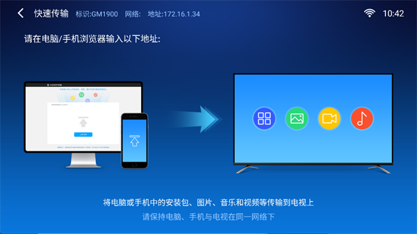 3、请在电脑/手机浏览器输入以下地址:192.168.0.54:56789,将电脑或手机中的安装包、图片、音乐和视频等传输到电视上。