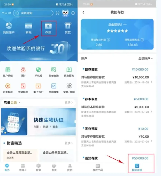 首页→存款→我的存款→可以查看存款产品;